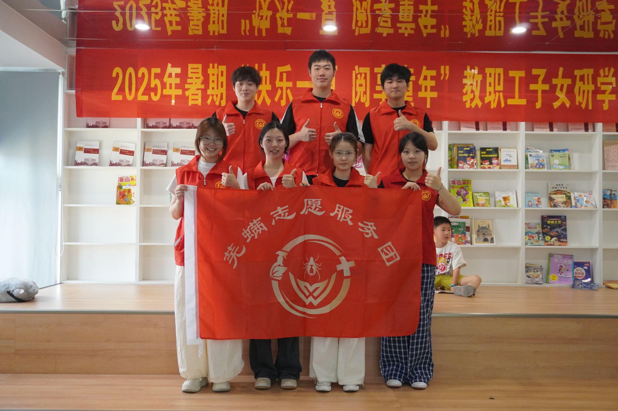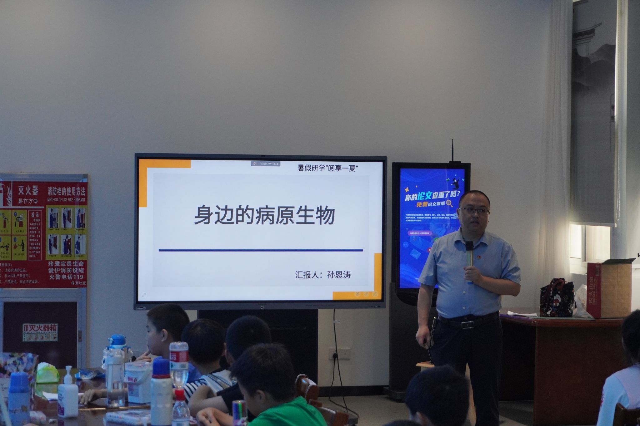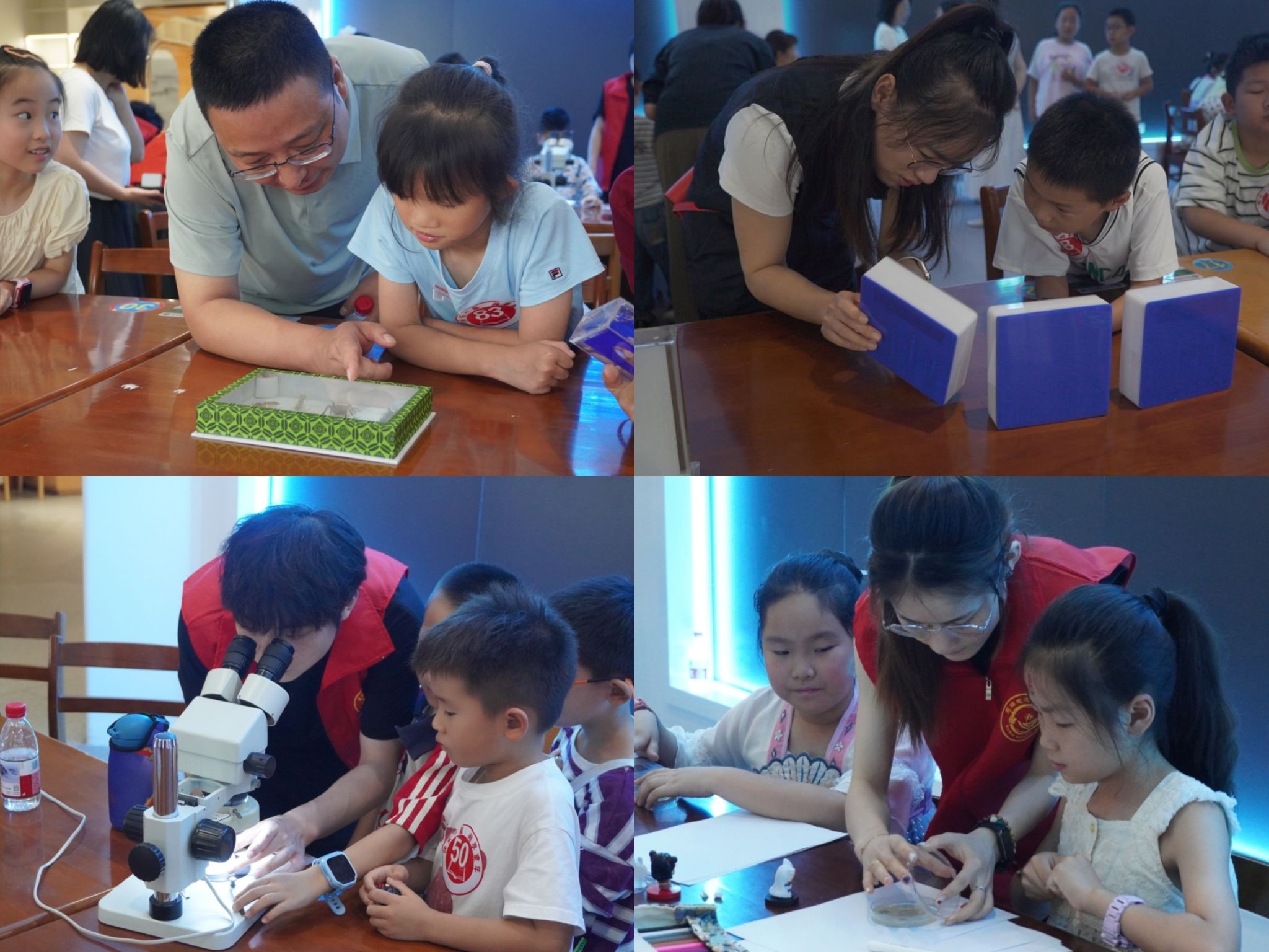 在中国共产党成立104周年到来之际,为隆重庆祝党的生日,发挥基层党组织政治功能和组织功能,太阳成集团官方网站党委卫检教师党支部7月2日上午在图书馆五楼自主学习中心开展“快乐一夏、悦享童年”研学志愿活动。书香漫洒处,党旗漫卷开,一场由卫检教师党支部主导、“芜螨”志愿服务团积极参与的活动火热开展。90余名教职工子女在支部党员的引领下,以“身边的病原生物”为钥,开启微观世界的科学探秘之锁。