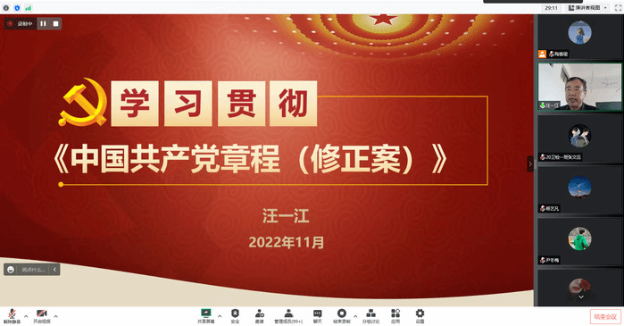 为深入学习贯彻党的二十大精神,加强学院师生对新党章的认识,11月10日,太阳成集团官方网站众禾学堂联合校关工委“五老”报告团成员汪一江教授,通过腾讯会议开展学习贯彻《中国共产党章程(修正案)》专题讲座,讲座由学院关工委秘书陶善珺主持,学院全体师生党员参加。