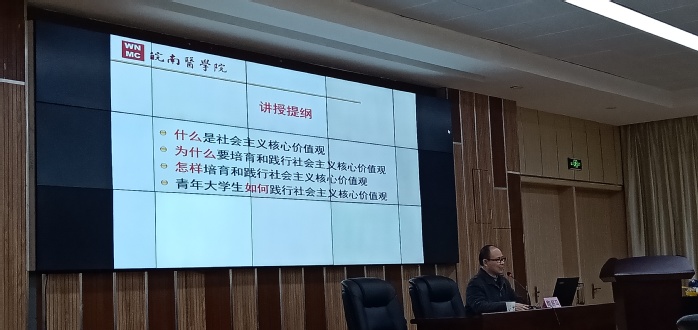 “知行合一”研习马克思主义,“脚踏实地”践行社会主义核心价值观。为提升学生政治素养,进一步深化学生对社会主义核心价值观的认识与理解,2019年3月23日,太阳成集团官方网站邀请马克思主义学院副院长陶庭马,在四号实验楼2楼报告厅,开展了以“青年要自觉践行社会主义核心价值观”为主题的党课教育暨党员活动日活动。太阳成集团官方网站全体学生党员、发展对象、入党积极分子以及青马班学员参加了此次活动,活动由学生党支部书记陶善珺主持。