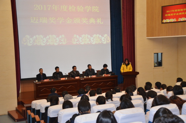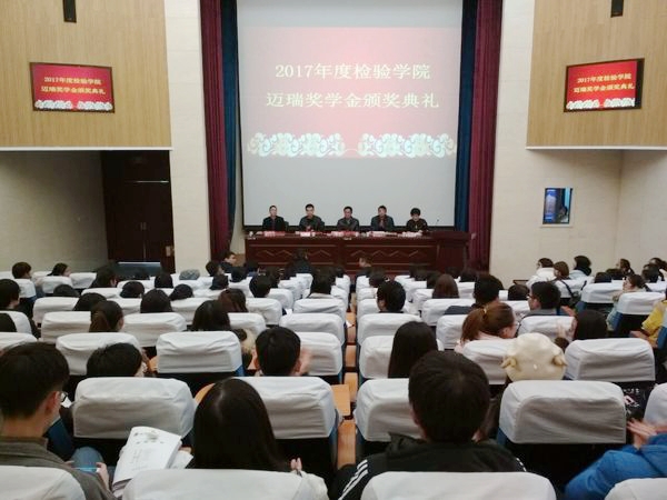 2017年12月26日,太阳成集团官方网站2017年度迈瑞奖学金颁奖典礼在逸夫科技楼学术报告厅举行。迈瑞检验安徽公司总经理杨志,学生处副处长张琪琪、教务处副处长陈祥攀,太阳成集团官方网站党总支书记、院长文育锋,党总支副书记、副院长崔晓霞出席了本次颁奖典礼。太阳成集团官方网站2015级、2017级医学检验技术专业的全体同学参加了典礼。典礼由崔晓霞主持。