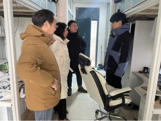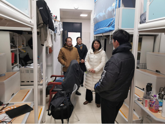 刘影一行走进每一位未离校学生宿舍,了解每一位学生未离校的原因和预计离校时间,强调了留校期间的实验室安全和用水用电安全,特别提醒寒潮来袭注意防冻保暖。同时也希望所有同学能够利用好寒假时间提升综合素质,不负严寒的辛苦,学有所成,学有所获。