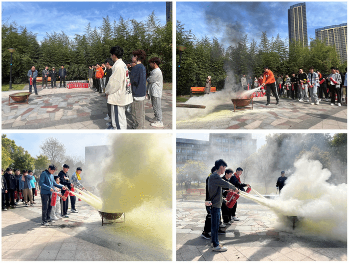 随后在四号实验楼西广场由消防人员带领所有同学进行灭火实战演练,卢举纲演示灭火器的使用方法,指导师生亲自体验,活动在所有师生的积极配合下圆满结束。