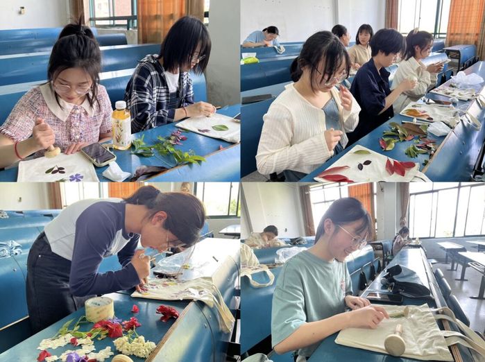 活动中,每组同学以白色帆布包、白色风筝为载体,利用采集好的新鲜植物进行帆布包的拓印,采用丙烯颜料进行风筝的彩绘,有以枫叶为主体,塑造出一幅红叶满山的风景;有以绣球花为主体,描绘出一幅春和景明的场景。在颜料的渲染下,风筝被赋予色彩斑斓的新活力。画面丰富,色彩鲜明,每一件作品充满了创意和灵感。
