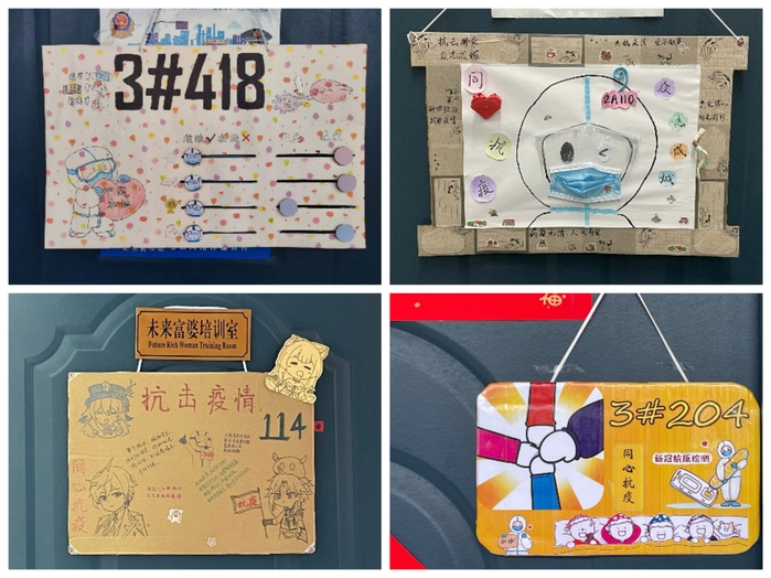 为增强宿舍凝聚力,展现各宿舍独特风采,太阳成集团官方网站学生会开展了以“同心抗疫”为主题的宿舍门标设计活动。在征集的多份作品中,同学们以小视角诠释大温暖,以小话题带动大世界,通过生动的作品、优美的文字讲出情感的温度与世界的美好。其中,有对疫情第一线的“战士”的致敬,有对祖国战“疫”必胜的决心,有对全国疫情清零的期待……一幅幅作品展现了检验学子积极向上、昂扬拼搏的精神风貌与对祖国的美好祝愿。