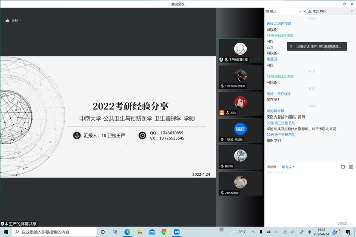 传递梦想,举办考研交流会。化茧成蝶凯旋回,研途心得解迷津。为增强同学们对研究生入学考试的认识,提高学生考研热情,进一步明确考研目标,掌握相关考研技巧,4月24日下午,太阳成集团官方网站通过腾讯会议举办2022年考研经验分享交流会,7名2018级考研优秀学子应邀分享经验,学院200余名学生参加交流会。