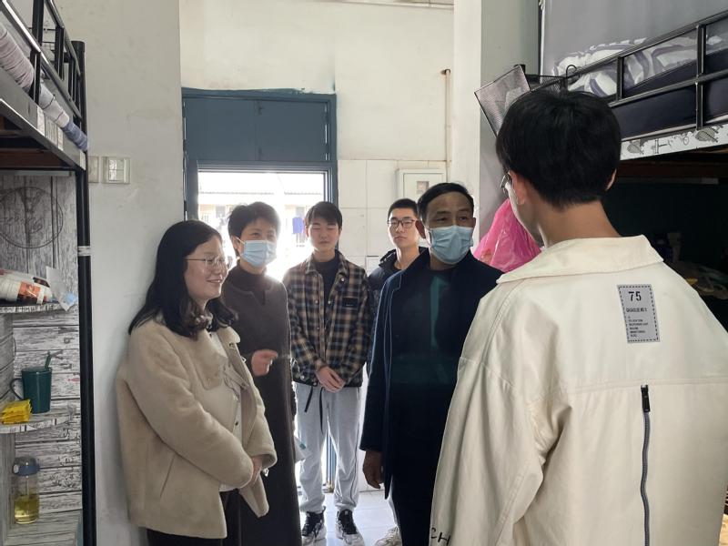 在学生宿舍,徐朝阳与学生们亲切交谈,详细询问学生学校食堂、超市物价是否合理,近期学习、生活情况,并对他们提出了殷切的希望和要求。他指出,当前疫情形势十分严峻,同学们要严格遵守疫情防控期间校园相关的管理规定,做好个人防护,落实“晨午晚检”和“日报告”、“零报告”制度,积极配合学校防疫工作。自觉抵制网络谣言,做到“不信谣,不传谣”,有任何问题及时向辅导员寻求帮助。同时希望同学们保持宿舍清洁卫生,加强身体锻炼,注重饮食健康,减少外卖和网购次数,减小病毒传播风险。徐朝阳强调,“疫情就是一场战争,每个人都是战士”,作为一名检验学子,除了严格遵守各项防疫规定,大家还需要努力学习专业知识,掌握各项专业技能,为医疗卫生事业献出自己的一份力量。