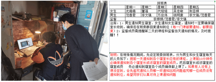 为确保线上上课的教学质量和同学们学习效果,在学院做好教学督导的同时,太阳成集团官方网站学工队伍定时深入宿舍检查学生上课状态,并要求各班上报课前提醒、课中监督、课后反馈的班委值班表,此方案在提高课堂效率的同时,也提升了同学们的自律意识,一定程度上促进了学生的学习效果。