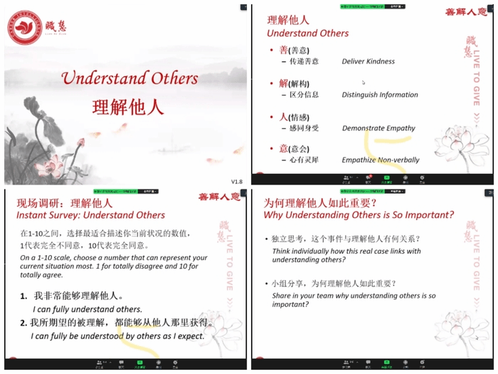 会议伊始,刘司玥指出,“理解”是构建人与人之间沟通的桥梁。接着,她从“善”、“解”、“人”、“意”四个方面讲解了如何接纳对方,如何有效区分感受和想法,以及如何通过各种非语言和语言沟通来练习展现同理心,成为善解人意的人,实现高效沟通等。在互动交流环节,刘老师耐心地解答了同学们提出的困惑。