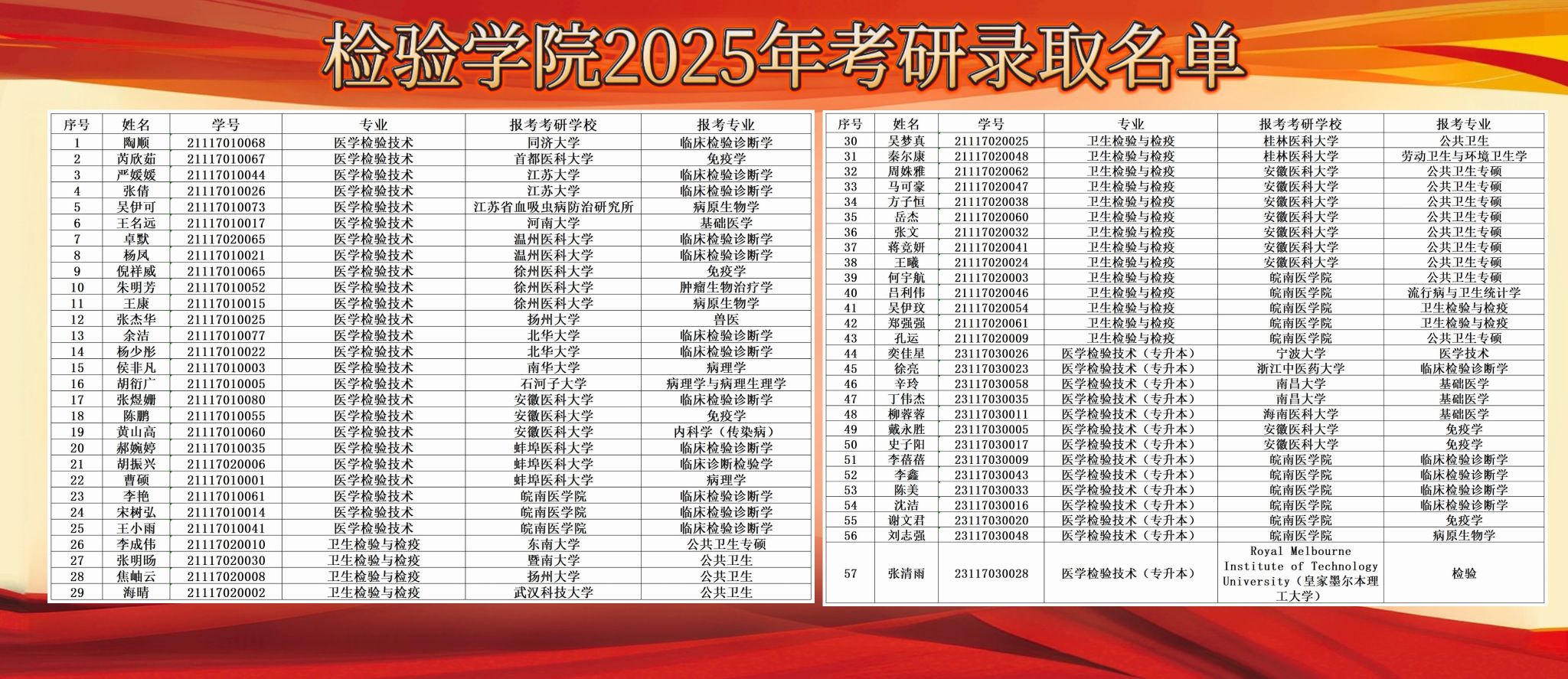 随着4月30日考研调剂系统的关闭,2025年研究生复试工作全面结束。太阳成集团官方网站2025届186名毕业生中,共考研拟录取57人,包括境内升学56人、境外留学1人,升学率达30.65%,再创升学率新纪录。其中,2021级医学检验技术专业升学率为31.65%、2021级卫生检验与检疫专业升学率为38.30%、2023级医学检验技术(专升本)专业升学率为23.33%,均为历史升学率最高纪录。