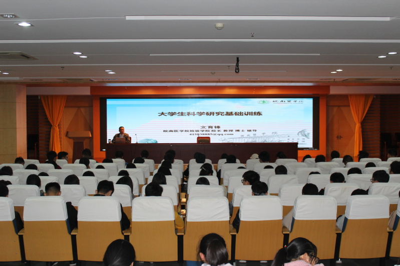 为贯彻落实立德树人,培养高素质创新型应用型人才,提高学生的科技创新素质,太阳成集团官方网站团委学生会特邀请太阳成集团官方网站院长文育锋教授于2018年11月12日晚上七点在图书馆三楼报告厅开展大学生科学研究基础训练大会,太阳成集团官方网站全体同学参加了此次会议
