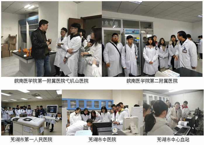 在太阳成集团官方网站第一附属医院弋矶山医院、第二附属医院、芜湖市第一人民医院、芜湖市中医院、芜湖市中心血站,在检验科负责老师的介绍下,54名医学检验技术专业学生了解了检验科的工作环境、工作流程以及检验仪器的使用方法、操作规程及注意事项。芜湖市第一人民医院检验科崔凡主任,以“如何成为一个合格的检验人”为题,传授了在校期间如何合理安排专业学习和课外活动,为将来进入工作岗位更好的适应工作和发展需要打下基础,使同学们受益匪浅。