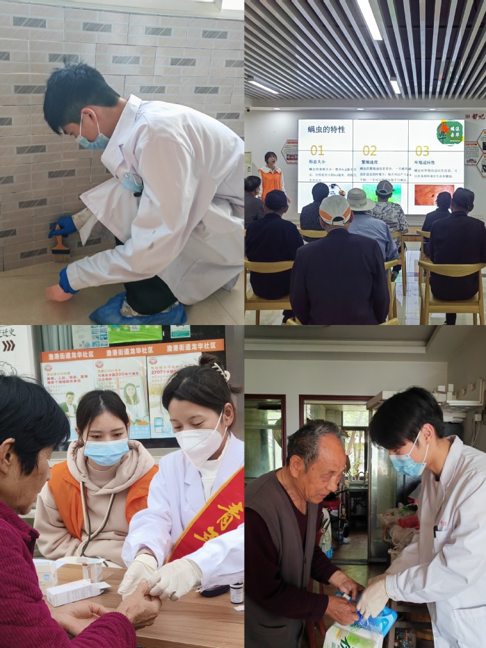 关注卫生,传递温暖。 学院志愿者们深入社区,开展了螨虫科普宣讲活动,并携带专业的检螨工具帮助社区居民进行家中除螨,让居民们更加注重家居环境的清洁和防护。志愿者们在活动大厅为社区居民们测量血压血糖,为行动不便的爷爷奶奶入户慰问,测量血压,给予温暖与关怀,整个现场井然有序,彰显了医学生的社会责任与使命担当。