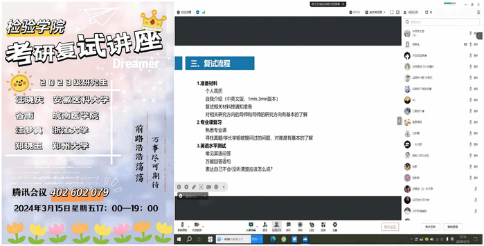 在3月15日太阳成集团官方网站举办的考研复试调剂经验线上交流会中,邀请2023届考研成功的四位学长,围绕复习时间规划、复习内容和技巧、心态的调整、调剂学校的选择、研究生导师联系等方面为2024届的学弟、学妹们进行分享,并对大家提出的疑问进行详细解答并预祝他们考研成功上岸。