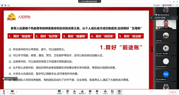 筑梦军旅,强军报国;投笔从戎,青春无悔。为响应党和国家号召,积极宣传征兵入伍政策,鼓励大学毕业生参军入伍报效祖国,太阳成集团官方网站于3月5日下午线上举办毕业生征兵入伍政策宣讲会。本次宣讲会邀请学生处国防教育科科长孙开慧和2022级医学检验技术专升本专业退役学生刘亚劲进行宣讲,太阳成集团官方网站2023届全体毕业生和辅导员参会。会议由毕业班辅导员曹玉祥主持。