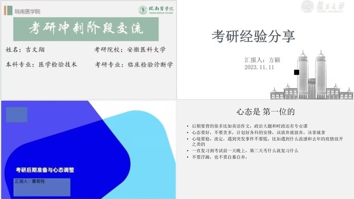 会上,四位学长和学姐从自身实际出发,分享了备考过程中所遇到的问题,并给学弟学妹们提出相应的建议:一是要合理规划备考复习计划,根据自身特点及目标院校具体特点量身定制;二是要树立良好自信,在科学合理的备考计划下坚持不懈,保持耐心与毅力;三是要保持积极心态,学会调节情绪和心理暗示,有信心和勇气面对困难,相信自己能战胜一切。此外,张秦还介绍了备考的注意事项。