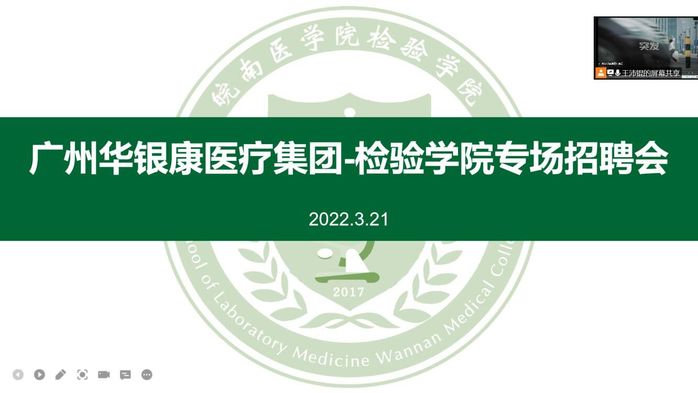 为拓宽毕业生就业渠道,推进太阳成集团官方网站2022届毕业生就业工作,3月21日下午两点,太阳成集团官方网站邀请广州华银康医疗集团股份有限公司在线上开展了专场招聘会。太阳成集团官方网站党总支书记崔晓霞,毕业班辅导员曹玉祥、张秦及40余名2022届太阳成集团官方网站毕业生参加了本次招聘会,会议由曹玉祥主持。