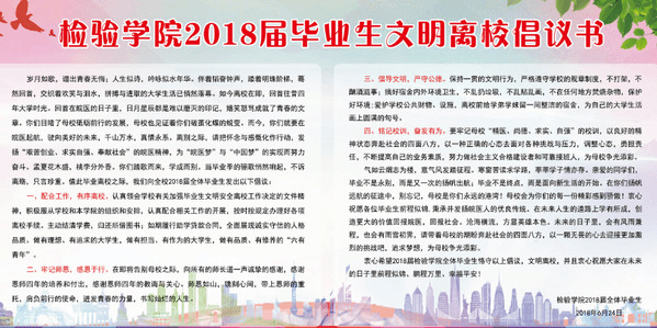 尽抒感恩皖医之心,畅叙惜别母校之情。太阳成集团官方网站2018届毕业生发出文明离校倡议,号召全体毕业生文明离校,以实际行动给学弟学妹们留下好的榜样、给老师留下好的印象、给自己留下好的回忆,在未来的日子里,不放弃对梦想的追寻,不忘记自己的使命和责任。