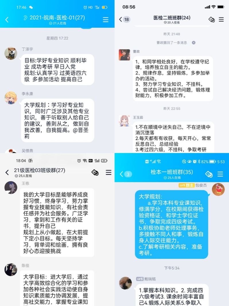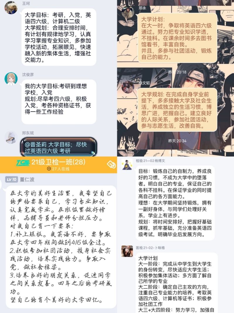 有目标的人生才有方向,有规划的人生才更精彩。为促进新生更好的规划大学生活,树立清晰的奋斗目标,同学们互相交流,积极规划,为自己的未来定下了方向,为自己的青春谱写了章程。其中巩固专业知识、考研、拓展兴趣面、优化人际圈等词汇都出现在许多人的规划中。字里行间,大家对大学生活的美好生活充满期待,对自己的既定目标信心满满。