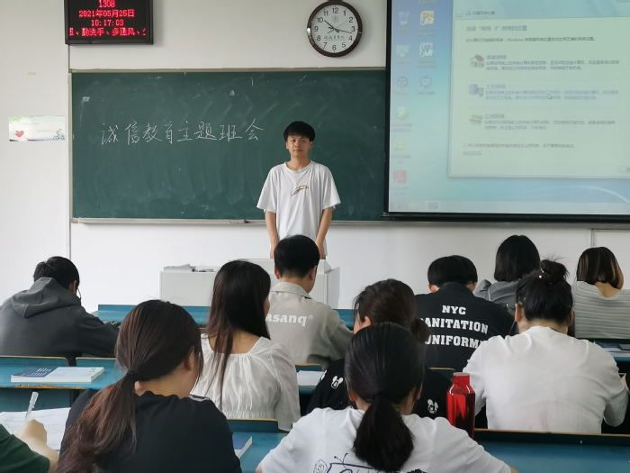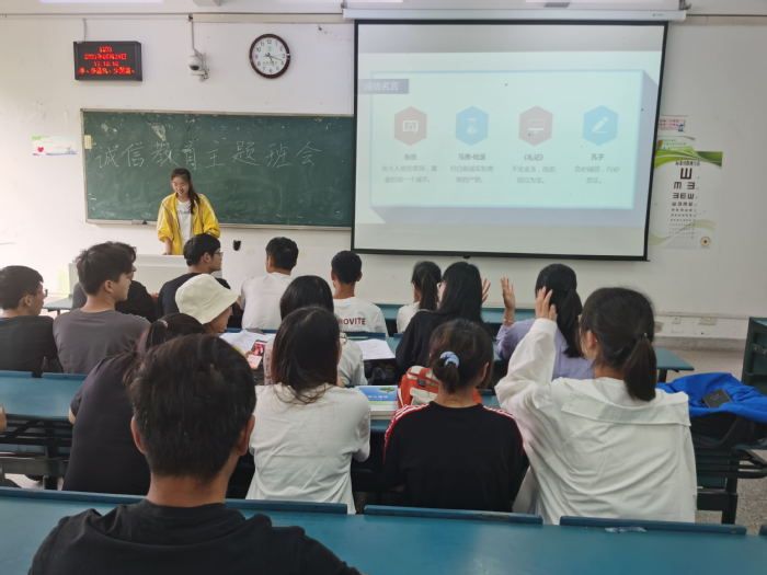 活动伊始,以班级为单位,各班开展主题班会。班长借助PPT从诚信的定义、具体内容和大学生行为准则三方面向同学们介绍了诚信教育相关内容,深入剖析了当代大学生不诚信、不守规矩约定的现象与原因。随后通过播放相关真实案例视频,加深了同学们对诚信的认知。部分班级在此次活动中还号召同学签署诚信考试承诺书,规范自身行为,端正考试态度,杜绝考试作弊现象。同学们纷纷表示对此次活动感受颇深,并将严格要求自己,努力做到诚实待人、信守承诺。