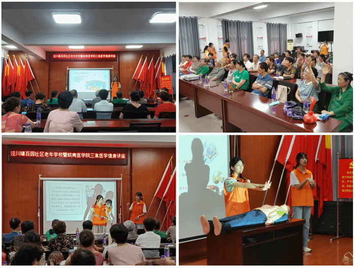 “三高”预防,急救科普。在社区会议室,志愿者开展“三高”预防和急救科普医学知识宣讲。宣讲过程中,志愿者将宣讲解答和操作示范相结合,用通俗易懂的语言和生活中的例子讲解相关医学知识。听众与志愿者进行积极互动,现场气氛活跃。
