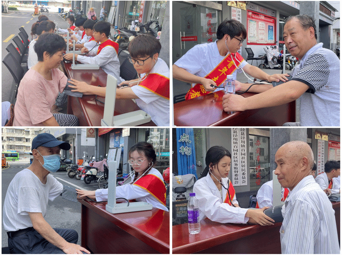 血压检测,健康问候。志愿者在百园社区门前搭建血压检测服务工作台,为来往居民进行血压测量,同时根据其健康史和饮食习惯等给出合理建议,指导居民合理饮食、坚持锻炼。青年志愿者用实际行动为社会大众做出自己的微薄贡献,展现出了医学生的社会担当。