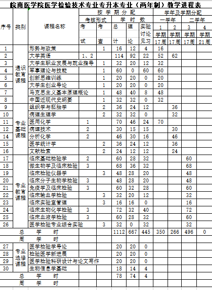主要课程:临床检验基础、临床生物化学检验、临床免疫学检验、临床微生物学检验、临床血液学检验、分子诊断学、临床检验仪器学、临床实验室管理学、医学检验综合实验等。